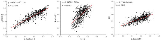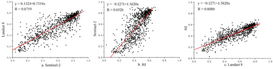 Figure 4. Correlation analysis of NDVI value based on random points (The figures include the conversion equation and correlation coefficient between every pair of sensors for NDVI. (a) shows the fitting result of NDVI between Landsat 8 and Sentinel-2; (b) shows the fitting result of NDVI between Sentinel-2 and HJ; (c) shows the fitting result of NDVI between HJ and Landsat-8).
