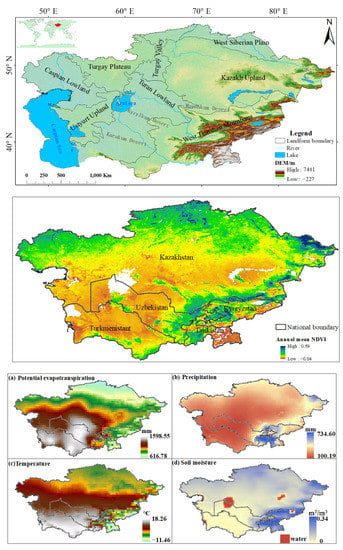 Central Asia is positioned in the hinterland of Eurasia, located in the middle and high latitudes of the eastern hemisphere, from 46°29′ E to 87°19′ E, and from 35°07′ N to 55°26′ N (Figure 1). Its altitude decreases smoothly from the eastern mountainous regions to the coastline of the Caspian Sea in the west [38]. In terms of topography, Central Asia is divided into the Caspian Sea Lowlands, the Turan Lowlands, the Turgay Valley, the Western Siberian Plain, the Ustyurt Highlands, the Turgay Plateau, the Kazakh Highlands, and the Western Tianshan Mountains [39]. The region is characterized by a temperate continental climate, with significant regional differences in its hydrothermal conditions, including spatial variance in precipitation, soil moisture, and temperature, all of which decrease from the mountains to the plains and from north to south [29,37,40]. According to long-term climate records, the average annual temperature of Central Asia increases from north to south, and decreases from the mountainous areas in the east to the plains in the west. The average yearly precipitation and soil moisture gradually decrease from the eastern mountains to the western plains. Specifically, annual precipitation is between 600 and 800 mm in mountainous and hilly areas, while it is less than 100 mm in the southern plains, and about 400 mm in the northern plain areas [41]. Near-surface soil moisture decreases from 0.34 to 0 m3/m3 from the eastern mountain to the central plain. Temperature in the southern plain varies from 2 °C in the north to more than 18 °C elsewhere [42]. Therefore, the vegetation coverage in the northern part of the study area is relatively extensive, comprising mostly rain-fed agricultural areas and grasslands, while the southern vegetation coverage is relatively sparse, with some deserts and areas of agricultural irrigation mostly concentrated along rivers. The eastern mountains are covered by forest.