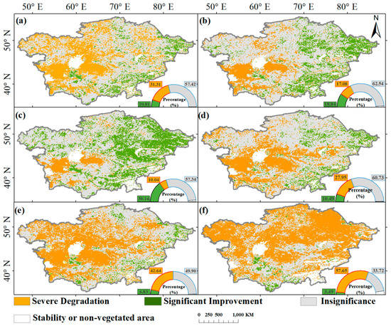 Spatial distribution of the variation tendency per year (a) and growing season (b), and for spring (c), summer (d), autumn (e), and winter (f), in the NDVI in Central Asia.