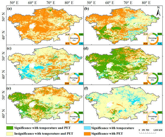 The significant influence of hydrothermal factors on vegetation changes varied seasonally (Figure 3 and Figure 4). As shown in Figure 3, most pixels showing a significant correlation between PET and vegetation were identified at the annual and growing season scales, accounting for 63.12% and 52.10% of total pixels, respectively, and a small number of pixels showed a significant correlation between temperature and vegetation (Figure 3a,b). At the seasonal scale (excluding winter), the area showing a significant correlation between vegetation and PET was much larger than that showing the effect of temperature (Figure 3c–e). As for winter, only 16.17% of vegetation was found to have a significant correlation with hydrothermal factors (Figure 3f). Based on the significance of the correlation between vegetation and heat elements, PET is a useful supplement to the analysis.