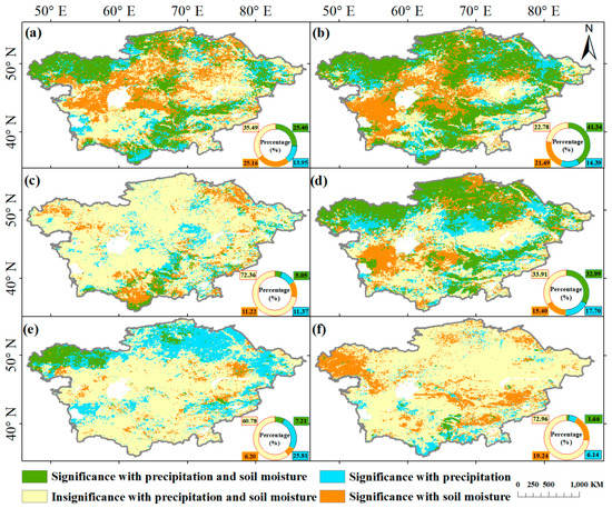 As shown in Figure 4, the area showing a significant correlation between soil moisture and vegetation was larger than that showing vegetation’s relation with precipitation at the annual and growing season scales (Figure 4a,b). At the seasonal scales, smaller areas showing the significant effects of precipitation and soil moisture were found in spring and winter compared to other seasons, but most of these were regionally independent of one another (Figure 4c,f). We found that most pixels showed a significant correlation between vegetation and precipitation, accounting for 50.69% of the total vegetation area in summer (Figure 4d), but soil moisture may better illustrate the relationship between vegetation and climate in the Ustyurt Upland area. In addition, precipitation had a stronger effect on vegetation in the northern region of Central Asia in autumn (Figure 4e). Thus, the combined water conditions of precipitation and soil moisture could more effectively substantiate the influence of climate on vegetation changes.