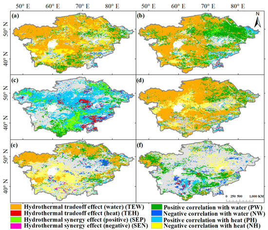 Spatial distributions of different function types for hydrothermal conditions affecting vegetation variations at the annual (a) and growing season (b) scales, and in spring (c), summer (d), autumn (e), and winter (f).