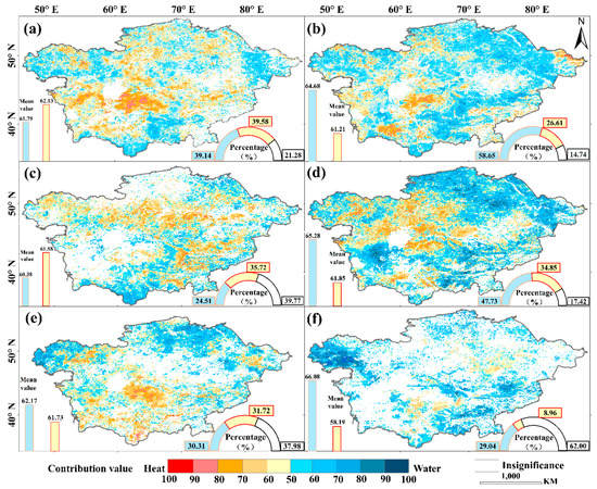 The regional differences in the hydrothermal contribution values at the seasonal scale were significant. In spring, about 35.72% of the total study area was affected by thermal conditions, mostly in the southeast and middle regions of Central Asia, with an average contribution value of 61.58%. These areas were mostly grassland and positively correlated with temperature, indicating that the increase in temperature in spring can promote the growth of grassland vegetation, which is consistent with the results of Chu et al. and Propastin et al. [53,55]. The regions influenced by the contributions of water conditions were located in the the upper of the Aral Sea basin, and in southern Central Asia, with an average contribution value of 60.38% (Figure 6c). In summer, vegetation in the southern Karakum Desert and the middle of Central Asia was more influenced by thermal conditions, with an average contribution value of 61.85%. Moreover, 47.73% of the vegetation in the northeastern and southeastern mountainous and hilly regions of Central Asia was more influenced by water conditions, with an average contribution value of 65.28% (Figure 6d), showing that in the summers, in most parts of Central Asia, vegetation changes were affected by the interactions of water and heat conditions. The effects of water conditions on vegetation in the northern region exceeded those of heat conditions. On the contrary, the effects of heat conditions on vegetation growth were greater than those of water in the central region of Central Asia. In autumn, the latitudinal differences in the influence of hydrothermal conditions on vegetation variation were obvious; areas influenced by thermal conditions were concentrated in the southern part of Central Asia, accounting for 31.27% of the total study area, with an average contribution value of 61.73%. Areas where water conditions were the dominant factor were located in northern Central Asia, with an average contribution value of 61% (Figure 6e). These results are presumably attributable to the abundant precipitation in northern Central Asia, where the moisture conditions weaken the oppressiveness of thermal conditions. In south Central Asia, precipitation was relatively scarce, and water conditions had a weak influence on thermal conditions. Therefore, changes in thermal conditions had a greater impact on vegetation. In winter, the areas dominated by thermal conditions were concentrated in the Kazakh Upland and the Aral Sea basin, accounting for 8.96% of the total study area, with an average contribution of 58.19%, while the areas dominated by water conditions were broadly scattered in the northern, western, and eastern regions of Central Asia, with an average contribution of 66.08% (Figure 6f). As winter is the non-growing season for vegetation, in most areas, the correlation between vegetation and hydrothermal conditions was insignificant. The relationship between NDVI and hydrothermal conditions depended on the land coverage. For example, the vegetation in river irrigation areas was more affected by thermal conditions [37].