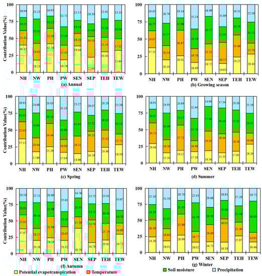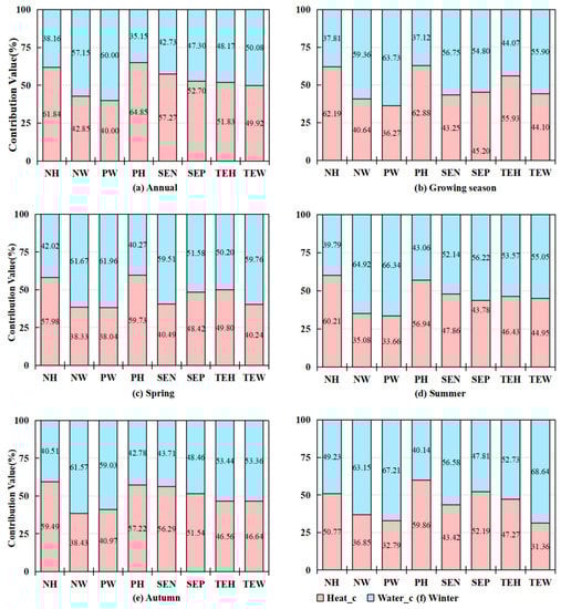 At the seasonal scale, the contribution value of increasing warming conditions to vegetation greenness was greater than that of water conditions in NH and PH, while the contribution of increasing wetting conditions to vegetation growth was greater than that of thermal conditions in NW and PW. The contribution value of increasing wetting conditions to vegetation changes in SEN and SEP was greater than that of warming conditions in spring and summer, but warming conditions contributed more to vegetation changes than water conditions in autumn and winter in SEN and SEP areas. The positive contribution value of increasing wetting conditions to vegetation growth in TEH and TEW was greater than that of warming conditions at the seasonal scale (Figure 7c–f). The results show that the synergy and tradeoff effects of hydrothermal conditions varied with the season. In most areas, heat conditions made a greater contribution to vegetation growth in spring. In summer, with the increase in temperature, the limiting influence of thermal conditions on vegetation was strengthened in TEW, and with the increase in precipitation, the tradeoff effects of water conditions on thermal conditions were strengthened in PW. In autumn, with the decrease in precipitation in most areas, the tradeoff effect of water conditions on thermal conditions weakened, and the inhibitory effect of thermal conditions on vegetation increased. In winter, the contribution values of water conditions in most areas were greater than those of heat conditions, but the contribution value of heat conditions were higher than those of water conditions in irrigation areas.