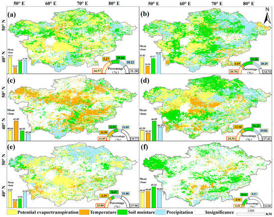 The contributions of hydrothermal conditions to vegetation changes at the annual (a) and growing season (b) scales, and in spring (c), summer (d), autumn (e), and winter (f), and the proportions of different factors’ main areas of contribution in the total study area (pie chart), together with the average contribution value (mean value) of hydrothermal factors.