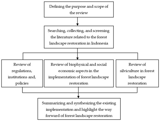 This review paper aims to provide an overview of forest landscape restoration progress in Indonesia, including the basis of implementation, supporting and inhibiting factors, as well as the benefits obtained. The article is prepared with a synoptic review approach to FLR-related articles and nationwide experiences (see Figure 1). Materials in the review come from national and international research papers, technical reports, and relevant books. The scope of the review includes theoretical perspectives on FLR based on hydrological, biodiverse, carbon, and socioeconomic factors. It also examines the regulations, institutions, and policy aspects supporting FLR, and discusses the implementation of FLR, including the criteria and indicators and their benefits in climate change mitigation, hydrology, soil improvement, biodiversity, and livelihood. The review also involves applied silvicultural techniques, monitoring, and evaluation.