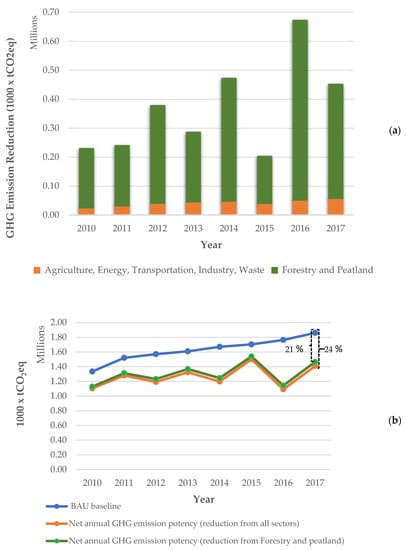 The achievement of GHG emission reductions reported by MoNDP [177] in 2017 was 24%, of which 21% came from the contribution of forestry and peatland. The GHG emission in BAU baseline was 1860 MtCO2e in 2017, with cumulative emissions during 2010–2017 of 13,030 MtCO2e. Net GHG emission potency in 2017 was 1465 MtCO2e after emission reduction from the forestry and peatland sector, and 1408 MtCO2e with an emission reduction of all sectors (Figure 3). A recent report by MoEF [6] stated that the GHG emission reduction of the forestry sector in 2018 was only 37 MtCO2e against the baseline. This figure was far less than in 2017 due to an escalation in forest and peatland fires in 2018.