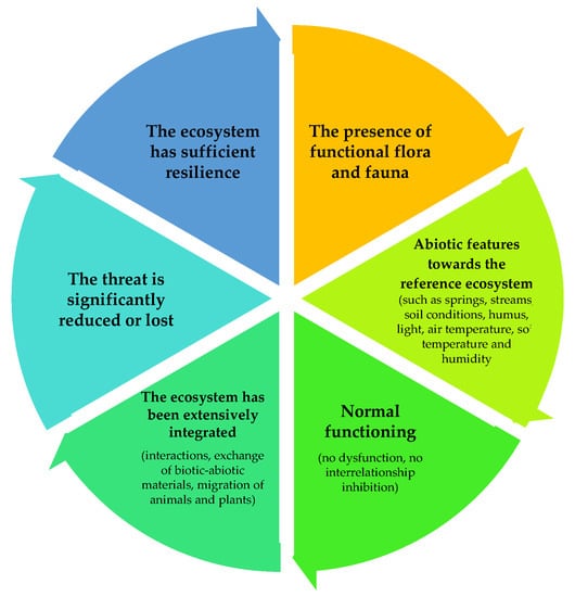 At the indicator level, the criteria used are generally inexpensive, easy to measure, and quick to assess. For example, at the site level, the restoration of forest ecosystems in various forest types generally uses vegetation diversity as an indicator of restoration success compared to ecological processes or reproductive populations, which require commitment, time, cost, and special expertise. Vegetation diversity is relatively easy to inventory, and vegetation is also associated with many functions of forest ecosystems [98]. At the landscape level, biodiversity is generally used as an indicator of restoration success. The list of indicators commonly used to assess the progress of landscape-based restoration activities are presented in Table 5