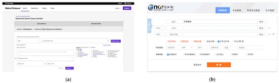 Advanced search pages for WOSCC (a) and CNKI database (b).