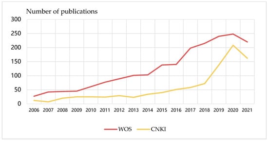 After the above steps, knowledge maps of countries, disciplines, authors, keywords, clusters, timeline, time zone, and burst words can be obtained. This study consists of four parts corresponding to the four sections of Section 3. The first part is a preliminary overview of the published literature quantity. The second part is a visual analysis of the literature data of the WOSCC using CiteSpace to understand the global research status. The third part uses CiteSpace to analyze the literature of China, the largest developing country with the largest contribution in recent years, in its own authoritative database, which helps to better understand its contribution and research differences. The fourth part compares the burst words in global studies with those in China to analyze the differences in research hotspots.
