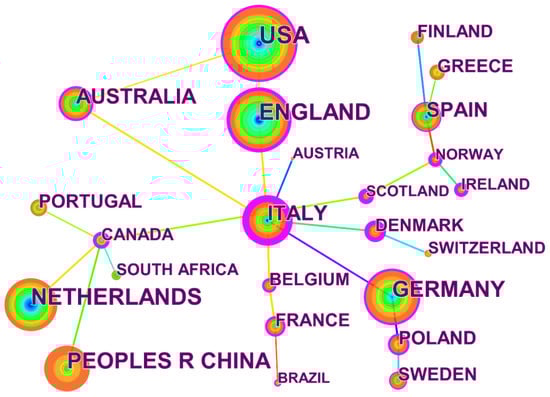 CiteSpace was used to analyze the countries of publication and a map was generated (Figure 5). The color of the node circle layer represents the change in the author’s publication time, the node size represents the number of studies, and the more connected lines the closer cooperation they have. As can be seen from Figure 5, the United States has the largest number of publications in this field, and there are also many published studies in the United Kingdom, Germany, Italy, and China. Italy has conducted the most research in this area in cooperation with other countries.