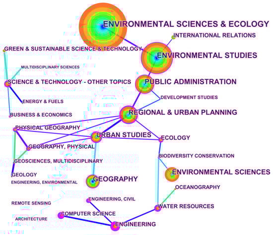 As can be seen from Figure 6, environmental science and ecology, public administration, regional and urban planning, and other disciplines worldwide pay more attention to spatial planning. Regional and urban planning has a stronger correlation with other disciplines, and there is some crossover between disciplines; however, the overall correlation is not strong.