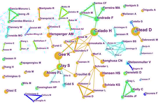 The global authors’ knowledge map was plotted by CiteSpace, and the following figure (Figure 7) was obtained. Stead D, Calado H, Gee K, and Jay S were key contributors. Stead D reviews the evolution of spatial planning policies based on geopolitical conditions in Europe, especially since the 21st century, as well as the research exploring participatory spatial planning [98,99,100,101]. The other major authors have studied the sustainable development of marine space and the establishment of a spatial planning system [102,103,104]. However, at the same time, we can see that, except for the author cluster with Calado H, Gee K, and Jay S as the main nodes in orange, the cooperation between other authors is not very strong.
