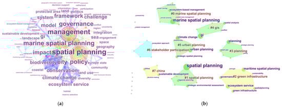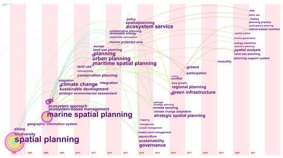 Research on “marine space planning” occurred relatively early. Many studies have focused on the discussion of marine spatial planning and ecology [105,106], the interaction between land and sea [107], the determination of marine space utilization for different marine uses, and the promotion of sustainable development of the marine economy [108,109,110]. China was involved in the spatial planning discussion at a relatively early stage. Since 2009, the problems caused by climate change have become increasingly obvious, and the issue of sustainable development has gradually attracted attention. Researchers have discussed how to solve the problem of sustainable development through spatial planning. Since 2011, the vision of spatial planning has gradually turned to land use and urban planning and has built an ecological service system through spatial planning. In 2013, spatial planning and ecosystem services became increasingly closely linked. In 2014, sustainability became a hot topic in the field of spatial planning. In 2015, more spatial planning strategies were adopted to deal with climate change, and green infrastructure was implemented to address the problem of unbalanced regional development, emphasizing citizen participation, equity, and justice. After 2019, there has not been a significant research hotspot, indicating a continuation of the previous discussion.