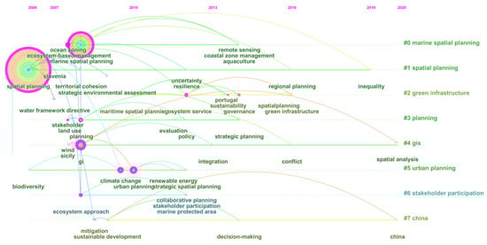 By combining the co-cited keyword clusters with the timeline (Figure 10), the time span formed by the keyword clusters can be seen more clearly. For example, marine spatial planning started early, but after 2013, the research center of spatial planning gradually shifted. The application of GIS technology has been widely used; GI and stakeholder participation has been more concentrated at a particular time, while the discussion on spatial planning in China has continued since 2008–2009.
