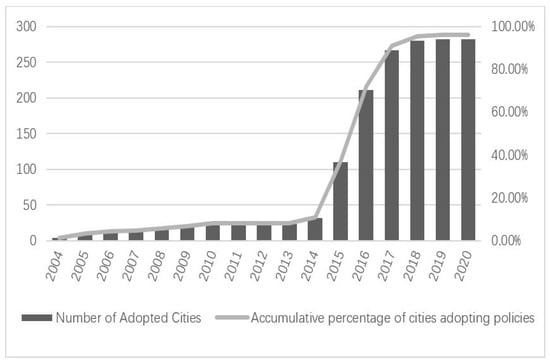 Since the 1960s–1970s, a global upsurge has occurred in PPP model expansion. Compared to developed countries in Europe and the United States (US), China’s PPP development has obtained central policy support with many PPP projects rapidly launched. By 2017, PPP development had achieved full coverage of 31 provincial administrative units in China. Statistics show that more than 90% of prefecture-level municipal governments had adopted this reform strategy by the end of 2020 (Figure 1). In the face of this explosive growth, imperfect contracts have led to hot policy and cold practice, deviation between policy objectives and local government behavior, frequent rent-seeking behavior, and other issues in China’s PPPs, which are affecting the efficiency of PPP policy diffusion in its distributed exploration. Xufeng and Zhao [] evaluated China’s social innovation policy and found that when implementing a new social policy, city governments must balance the social desires of local citizens with fiscal constraints; at the same time, they are influenced by administrative orders from higher-level governments and the vertical fiscal relationships between governments at different levels, as well as competitive pressures from other cities at the same level.