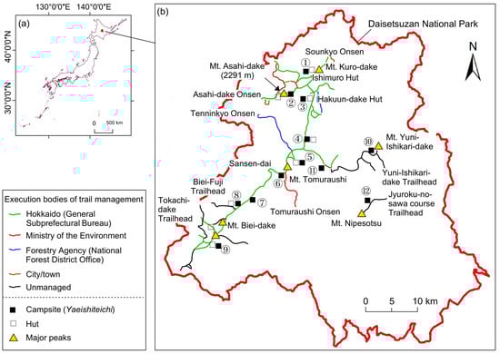 Study area of Daisetsuzan National Park (a) and the campsite distribution in the park area (b). See Table 1 for the names of the campsites ①–⑫.
