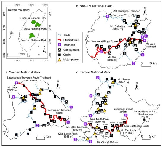 Maps of the Yushan (a), Shei-Pa (b), and Taroko (c) National Parks and the three studied trail sections (red bold lines).