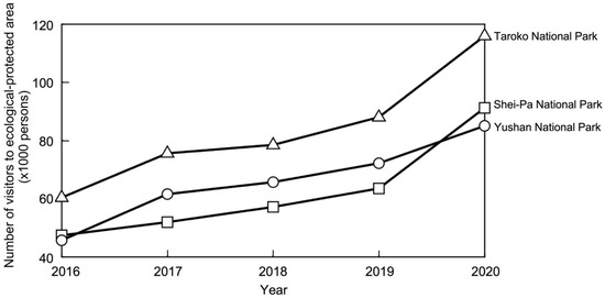 The mean annual number of visitors (2016–2020) of the three mountain national parks’ ecological-protected areas reached 66,099 (Yushan National Park), 62,317 (Shei-Pa National Park), and 83,720 (Taroko National Park), respectively (Figure 6). A sharp increasing trend was observed, even during the COVID-19 pandemic.