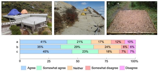 Perspectives of Daisetsuzan National Park’s users regarding the introduction of platforms (a) and tent pads (b,c) (n = 189). Photographs (a–c) were shown to respondents during the questionnaire survey. The photographs used were obtained from the following sources: (a): Tasmanian Wilderness, Australia ([]), (b): Enzanso campground in Chubusangaku National Park (taken by the authors), (c): Lost Horse Creek campground, Banff National Park, Canada (https://reservation.pc.gc.ca/Images/Sites/MB_LostHorseCreek-Re6_2.jpg; accessed on 25 November 2021).