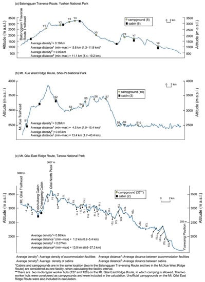 In contrast to the two other sections, the Yushan National Park’s Batongguan Traverse Route, where the smallest number of campgrounds were located, is dotted with cabins far from the trailhead (Figure 4a). The average density of the accommodation facilities at the Batongguan Traverse Route was the smallest (0.19 facilities/km). Conversely, the average interval distance between two adjacent accommodation facilities was the longest (approximately 5.6 km), with the longest interval distance being 11.9 km (Figure 8a). On the other hand, the Mt. Qilai East Ridge Route in Taroko National Park (Figure 8c) had accommodation facilities with the highest average density (0.86 facilities/km). Particularly, they have an average interval distance of 1.2 km (the shortest distance was 0.2 km) (Figure 8c). However, there are informal campgrounds at the Mt. Qilai East Ridge Route. As described below, we included these informal campgrounds in our calculations.
