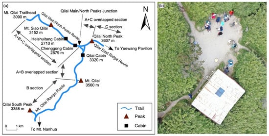 The “overlapped section” of the western part of the Mt. Qilai East Ridge Route in Taroko National Park (a) and the “camping space” in front of one of the three huts set up within the section (b) ((b): taken by a drone on 12 October 2019). The maximum number of people allowed to enter is 76 per day on weekdays (96 on weekends) for the A + B + C common section, 40 on weekdays (60 on weekends) for the A + B common section, and 76 on weekdays (96 on weekends) for the A + C common section. The maximum number of people allowed to stay overnight per day at the Heishuitang Cabin, Chenggong Cabin, and Qilai Cabin is 8, 44, and 8, respectively.