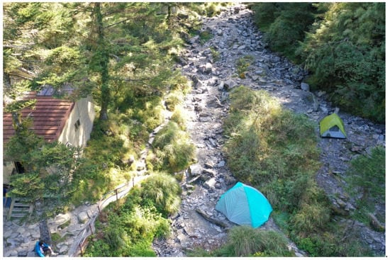 The Mt. Qilai East Ridge Route (Mt. Qilai Trailhead, Qilai North Peak, Yuewang Pavilion) is a 41.8-km long trail section with a 6- to 7-day itinerary. This is true especially for the section from the Mt. Qilai Trailhead to the Main/North Peaks Junction (overlapped Section A + B + C in Figure 9). It is a common section for the Qilai Main/North Peaks Route (A), Mt. Qilai Range Route (B), and Mt. Qilai East Ridge Route (C). Therefore, it has an extremely large number of users. The length of the route from the Mt. Qilai Trailhead to Qilai North Peak is 15.4 km round trip (about 12 h without rest). Conversely, the length of the route from the Mt. Qilai Trailhead to Mt. Qilai is 20.2 km round trip (approximately 14 h without rest). Few people trek through these sections in one day. In other words, most people using the A + B + C overlapped section from the Mt. Qilai Trailhead to the Main/North Peak Junction will stay overnight. If the number of people allowed to enter this trail section on weekends reaches the limit, 36 people will not be allowed to stay in the cabin and they must camp outside. There is a small space around the Heishuitang cabin and Qilai cabin where several tents can be pitched (Figure 9b). There is likewise some space available around the Chenggong cabin. However, campers will need to pitch their tents on the riverbank when it is crowded (Figure 10). The closest campground (T5 in Figure 8c) to the trailhead of the Mt. Qilai East Ridge Route is located 9.2 km away (requiring about 8 h of travel, one way, without rest). There is no limitation on the number of campers for this campground because park managers can just inform applicants about the reservation availability based on their judgment.