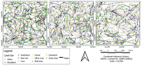 To explore the behavior of the different metrics in actual differentiated landscapes, we employed the abovementioned graph metrics to analyze landscapes in the Zone Atelier Armorique, a long-term socioecological research (LTSER) site, which is located in the northern part of Ille-et-Vilaine, Brittany, France (48° 36′ N, 1° 32′ W) (Figure 1). The study area is a hedgerow network (also called bocage) landscape characterized by mixed dairy farming and cereal production. We selected three contrasting landscapes (A, B, and C in Figure 1; ~900 ha each), 5–10 km apart and distributed along a gradient of hedgerow network density and farming practice intensity from the south to the north [38,39]. Graph analyses were performed with existing land-use maps of the three landscapes, considering eight land-use types: woodland, hedgerows, grassland, spring crops (mainly maize and pea), winter cereals (mainly winter wheat, barley, triticale, and oat), other crops (mainly apple orchards), water, and urban areas (roads and villages, including gardens).