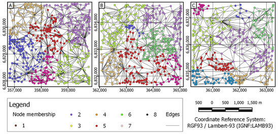 Graphs representing communities in landscapes (A–C) in the Zone Atelier Armorique. Each color represents a different community (from 1 to 8) based on greedy optimization of modularity.
