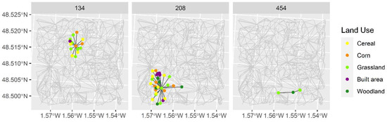 Application of graph metrics at the local scale of landscape B in the Zone Atelier Armorique in 2010. The metrics of the three groups are given for three contrasting nodes 134, 208, and 454.