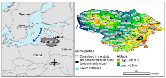 Study area: (left)—the location of the study area in Europe, (right)—the borders of the municipalities and elevation in Lithuania. The names of the municipalities are omitted in further illustrations, and they are basically supposed for a Lithuanian readership. Sources of the data used: (left)—thematicmapping.org/downloads/world_borders.php (accessed on 4 January 2022), (right)—GDB200 database from www.gis-centras.lt/ (accessed on 13 November 2021).