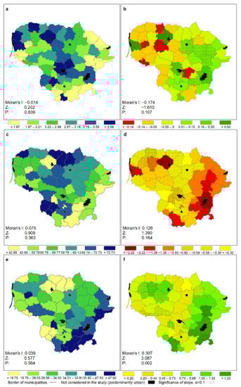 Current land covers and trends in land cover changes in Lithuanian municipalities since 1995 are illustrated in Figure 2. Although the values of the area proportions of major cover types are randomly distributed among the features, an inverse relationship between the dominance of agricultural areas and forest and seminatural areas is observed; that is, more forested municipalities dominate in the southeastern part of the country at the cost of agricultural lands, which dominate in north–central municipalities. Relatively larger proportions of artificial surfaces are in municipalities around larger cities. The dominant trend in the development of the area proportion of artificial surfaces was the increase in their area in 63% of municipalities since 1995, with a statistically significant trend in ten municipalities (Figure 2b). Usually, the urbanisation level was increasing around the municipalities around larger cities. The decrease in the proportion of artificial surfaces was statistically significant in just two municipalities. The proportion of agricultural areas has been decreasing in all Lithuanian municipalities since 1995, with a statistically significant slope of a linear trend in 11 municipalities. On the other hand, the proportion of forest and seminatural areas has been increasing in all Lithuanian municipalities, with a statistically significant slope of a linear trend also in 11 municipalities. Statistically significant global spatial autocorrelation supports the hypothesis about the spatially clustered pattern of municipalities with relatively larger increases in forest area in the eastern part of the country.