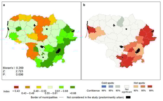 Land cover naturalness in Lithuania in 2018: (a)—land cover naturalness index in non-urban municipalities, (b)—statistically significant hot spots and cold spots using the Getis-Ord Gi* statistic.