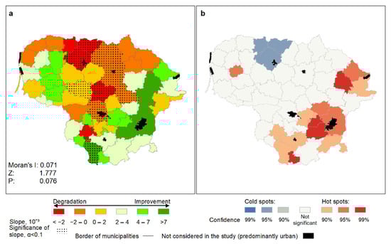Changes in land cover naturalness in Lithuania during the period 1995–2018: (a)—slope of the linear trend in changes of the land cover naturalness index in Lithuanian municipalities, (b)—statistically significant hot spots and cold spots using the Getis-Ord Gi* statistic.