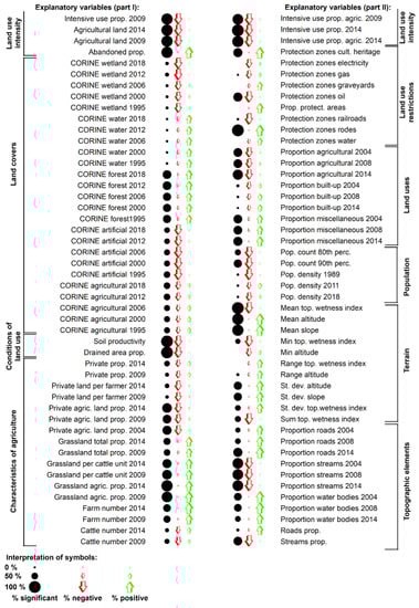 Various variables that are easily available from different databases and censuses, and which potentially correlated with land cover naturalness, were checked for their performance as predictors in the regression models. The Pearson’s correlation coefficients between the variable and the slope of the linear trend in the changes in the land cover naturalness index are provided in Appendix B, which lists all the explanatory variables. Figure 5 summarises the information on the potential of each variable to be used as a predictor in multiple linear regression models. Some variables were found to be statistically significant in all potential variable combinations. Usually, such were the variables associated with land use intensity (e.g., the proportion of land area under intensive use from total (agricultural), land and the proportion of abandoned agricultural land in the municipality), conditions of land use (average soil productivity score and the proportion of drained lands in the municipality), mean values describing the terrain, the density of streams, and characterising the agriculture in the municipality (e.g., area proportion of the perennial grassland). Demographic factors, such as population densities from different censuses, were among the poorest candidates as explanatory variables. It should be noted that the variables which were found to be statistically significant in the models were also consistent in the relationships; for example, increased variables associated with land use intensity usually resulted in decreasing land cover naturalness, as did the poorer soils and larger proportions of drained lands.