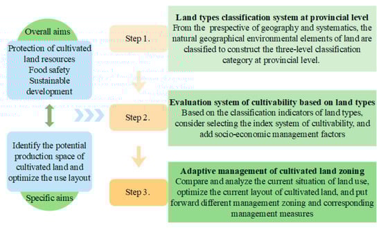 From the existing research literatures, the land types classification in China needs further in-depth study at the provincial level according to the current actual needs and development trend. For the evaluation of suitability for specific purposes, the traditional evaluation method is to select evaluation indicators to assess the suitability of cultivated land based on the current status of the use of cultivated land; however, it is only a judgment of the current status of use, and cannot know the land which is suitable for farming. The cultivated land resources are scarce, food security is serious, and we should pay attention to sustainable development; it is necessary to analyze the potential space of cultivated land based on the natural conditions. Therefore, this study in Henan province, one of the major food-producing province in China, was taken as a case study and carried out from the following three steps (Figure 1): (1) according to the existing research, we construct the provincial-level land types classification system; (2) based on the classification of land types, the evaluation system of cultivability can be established to calculate the degree of land suitable for cultivation in Henan; and (3) the calculated results are compared with the current situation of land use, the adjustable land use types are identified and divided into different management zones, and then the corresponding management measures are formulated. Finally, the cultivated land zoning adaptive management scheme based on land types is formed. The research results can provide ideas and reference for the potential spatial identification and optimal utilization layout of cultivated land resources.