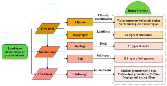 Land is a natural economic complex formed by the interaction of climate, geology, geomorphology, hydrology, soil, vegetation, and other factors in a certain section of the earth’s surface and affected by past and current human activities. It is a comprehensive system connected with the surrounding natural and human environment through material and energy interaction [,]. Classification is to divide things into different groups according to certain rules or purposes based on their attributes and characteristics. It is an effective tool for combing and analyzing things relationships and comparing vertical and horizontal differences []. To specifically describe land types for practice, land types classification based on the taxonomic principles can be described as the most direct method. From the perspective of geography, land types are comprehensively and systematically affected by the occurrence, development, and evolution of natural geographic elements. The main content of its research is to reveal the formation, characteristics, and structure of natural elements in a certain geographical area, reflecting the law of development and succession [,]. From the perspective of systems theory, the land natural system is an organic whole with a certain structure and functions formed by the interaction of two or more elements. The various elements are not mechanical or simple combinations with each other; however, it is a combination of elements formed through complex connection relations. Both internal and external have relevance and hierarchical structure, thus showing certain patterns, principles, and laws, and each element does not exist in isolation. Each element has a certain position in the system and plays a specific role []. Therefore, the classification of land types should have a certain level of hierarchy. Based on the relevant research, in this study, according to the systematic and scientific principles, dominant principles, regional differentiation laws, practical principles, etc. [,,], as well as the top-down structure of the hierarchy, a three-level classification category of the provincial-level land types classification system (Figure 3) was built from the five aspects of climate, topography, geology, soil properties, and hydrological conditions.