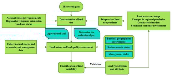From the perspective of planning, land suitability evaluation means that when land is used for specific purposes, such as agriculture, forestry, animal husbandry, etc., land suitability is graded according to the natural conditions, which involves the assessment of the climate, topography, soil, and hydrology of the environment [,]. Nowadays, most land resources have been fully developed, the current evaluation of cultivability is to optimize the existing problems of land use according to the current development status of land use, which should not only consider natural conditions, but also social economy and management mode. Therefore, based on the evaluation process in the “land evaluation—towards a revised framework” and some relevant research [,,], the cultivability evaluation thought map in this study is listed (Figure 4).