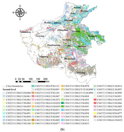 Among the third-level units, the shallow groundwater-alluvial (fluvial) loamy fluvo-aquic soil of the uplift/erosion low-altitude plain in the northern subtropical humid region (C041T11130GUFSG091H01) accounts for the largest area ratio of Henan (4.18%). Then, the middle-deep groundwater-alluvial soil of the uplift/erosion low-altitude plain in the northern subtropical humid region (C041T11130GUFSG091H02) accounts for 2.53%. Shallow groundwater-alluvial (alluvial) clay fluvo-aquic soil of the uplift/erosion low-altitude plain in the northern subtropical humid region (C041T11130GUFSG112H01), shallow groundwater-lake fluvo-aquic soil of the uplift/erosion low-altitude plain in the northern subtropical humid region (C041T11130GULSG013H01), and middle-deep groundwater-alluvial loam fluvo-aquic soil of the uplift/erosion low-altitude plain in the warm temperate semi-humid region (C032T11130GUFSG091H02) account for more than 2.00% of Henan.