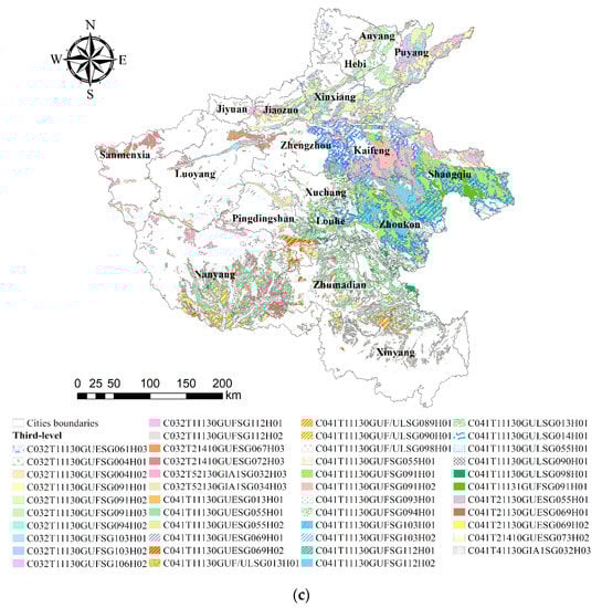 Distribution map of land types in Henan province. (a) Distribution map of first-level types, (b) distribution map of second-level types (top 45 by area proportion), and (c) distribution map of third-level types (top 45 by area proportion).