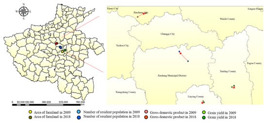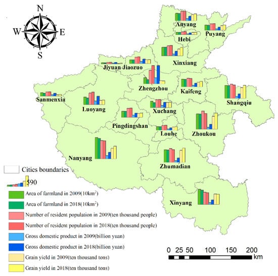 From the perspective of cities in Henan province (Figure 7), the cultivated land area of Jiaozuo City increased by 682.29 km2, while other cities decreased, and the area of cultivated land in Zhengzhou City, Xuchang City, Luoyang City, and Nanyang City reduced more than others, and superimposed on the spatial database of land types, it can be seen that in 2009 and 2018, the places with reduced cultivated land area are located in the western part of Henan, with high altitude. The terrain of the western region in Luoyang City and Nanyang City is high and the rock type is granite, which is not suitable for planting crops. In terms of the resident population, the number in western and northern regions increased except for in Anyang City, while the resident population in southern and eastern regions decreased. GDP in all cities increased, while grain production decreased only in Zhengzhou and Xinyang City and increased in other cities. It reveals that the social and economic development of each city has promoted the expansion of the scale of construction, which has reduced the area of cultivated land. However, to ensure food security and increase the yield of cultivated land, it is inevitable that the cultivated land somewhere was excessively used.