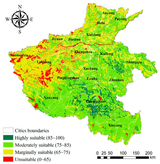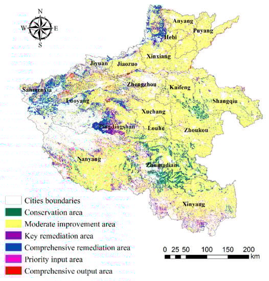 According to “land evaluation—towards a revised framework” [], this study followed the rules of avoiding drastic changes in existing construction as far as possible, and the evaluation results were used for the purpose of optimizing the current use. Based on the classification of land types, the calculation results of the cultivability evaluation were superimposed on the current land use types of Henan province. Taking cities as statistical units, the areas which are highly suitable and have current use for cultivation were divided into conservation areas. The areas, moderately suitable or marginally suitable have current use for cultivation, were divided into moderate improvement areas. The areas, unsuitable and have current use for cultivation were divided into comprehensive output areas. While the areas that are highly suitable, moderately suitable, and marginally suitable but do not have current use for cultivation were divided into priority input areas, key remediation areas, and comprehensive remediation areas, respectively, considering that the current land use can be adjusted. Combined with the basic database of land types and the evaluation results, the adaptive management suggestions for different zones can be put forward.