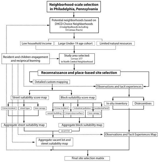 Urban land use and recreation planning to date have largely been concerned with ensuring a supply of formal playgrounds on a per capita or accessibility basis (e.g., up to 200 m to the nearest playground from all households; 9.9 acres of parkland per 1000 residents [31]). Our research, in contrast, seeks to strike a more nuanced and compelling balance between explicit standards and implicit and tacit site-based thinking that explores opportunities and disincentives that can be knit into a cohesive, more resilient play network. This network achieves continuity through safe streets and related interstitial spaces that link repurposed vacant lots selected from GIS mapping and site-based discovery. In the following sections, we first elaborate on the neighborhood-scale spatial data approach through computational and tacit knowledge mapping and then discuss the conceptual design process for the chosen neighborhood.