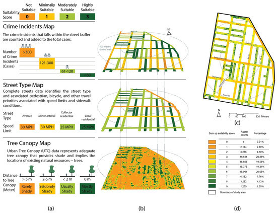 (a) Suitability Matrices for Streets; (b) Individual Street Suitability maps; (c) Aggregated Street Suitability map; (d) Street Suitability Score summary table.