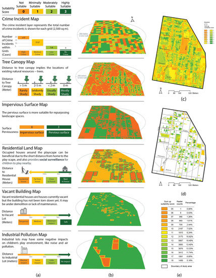 We used six major criteria in our block suitability analysis: crime incidents, distance to tree canopy, surface perviousness, and distances to occupied residential houses, vacant houses, and industrial lands (Figure 4). First, similar to the street-level analysis, crime incidents and distance to tree canopy were used to indicate the distribution of crimes and shade conditions for play within the neighborhood. Specifically, the crime data were sectored into 50 m × 50 m areas created by the fishnet tool in ArcMap. Second, surface perviousness was considered because existing permeable areas are more suitable for nature play and incur lower construction costs, which is crucial for low-income neighborhoods. Next, occupied and fully vacant houses and industrial lands were extracted from the Philadelphia Department of Planning and Development’s land use map as polygons. Distances to occupied houses were calculated to indicate safety or perception of safety due to the presence of observant residents near play interventions. In contrast, distances to fully vacant houses highlight risky and abandoned site conditions, prompting the planner to consider ways to minimize the possibility of children accessing derelict structures and grounds. On the other hand, vacancy mapping also points to opportunities for adaptive reuse of derelict and vacant properties to accommodate nature play. Additionally, distances to industrial lands were calculated to identify potential environmental risks, such as noise and air pollution, for children’s hearing and young lungs. Last, the Vacant Lot Aggregated Suitability map (Figure 4d) was created by overlaying the six individual maps and clipping the content to the vacant lot layer to highlight vacant lots as potential (re)design sites.