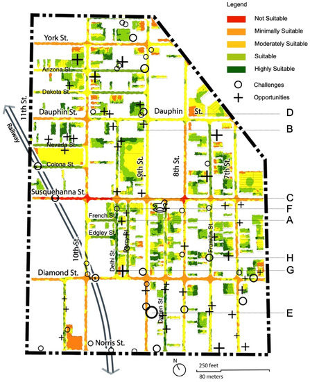 The final suitability map (Figure 7) shows most of the analyzed area as ‘moderately suitable’ (31.77%) and ‘suitable’ (37.02%) for implementing the play network, with 14.71% as ‘highly suitable,’ 1.36% ‘not suitable,’ and 15.14% for ‘minimally suitable.’ The ‘highly suitable’ streets are mostly alleys, such as French Street and Edgley Street (see location A, Figure 7). Lots, on the other hand, are rarely ‘highly suitable’ for the entire lot, primarily due to limited vegetation cover and derelict surface conditions. The best example was the corner of Dauphin Street and 9th Street (see location B, Figure 7), assessed as moderately to highly suitable. Taking advantage of the existing ‘highly suitable’ areas could greatly improve the cost-efficiency of the overall play network. Those ‘suitable’ and ‘moderately suitable,’ accounting for 68.79% of the analyzed vacant lots and streets, can be prioritized and modified or redesigned during the first phase of the route design due to fair existing conditions and relatively low cost of the modification. In contrast, the ‘not suitable’ and ‘minimally suitable’ areas are mostly streets with high traffic volume and vacant lots with low nearby occupancy and potential industrial pollution, such as Susquehanna Street (location C, Figure 7) and the lot at Dauphin Street and 8th Street (location D, Figure 7). Ideally, they would also be prioritized in neighborhood regeneration projects for hazard mitigation and safety enhancement. However, due to the focus on play in a neighborhood with extremely limited resources, these unsuitable areas are avoided in most cases, except when the play route must cross a street or lot that cannot be substituted by better selections.