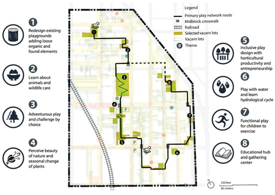 More specifically, first, relatively high-suitability streets and vacant lots up to 800 feet (243 m) apart (equivalent to 3-min walking distance) were selected to provide an accessible and continuous network with ample play opportunities. Next, the most prominent sources, including Loebach and Cox’s Typology for Capturing Children’s Play Behaviors in Outdoor Environments [39], Kahn Jr et al.’s keystone interaction patterns during child-nature interaction [40], and Maxwell’s discussion on types of play were used to identify eight categories of play (i.e., imaginative, biological, exploratory, expressive, restorative, physical, water and rule-based play) [41]. In addition to GIS analyses, our conclusions about which sites to (re)design and what play activities they may best accommodate were informed by our implicit, experiential understanding of local conditions and the ‘aha’ moments by simply being in the place.