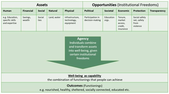Representation of the process of improving an individual’s well-being, understood in terms of assets, opportunities, functionings and capability (adapted from [38]).