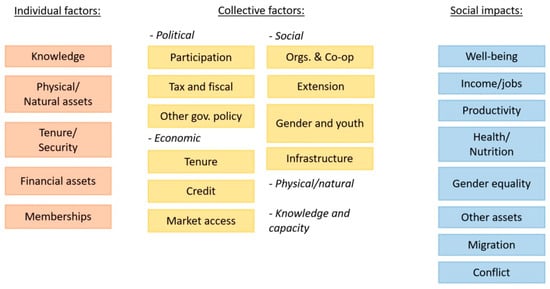 There were a range of other individual factors that were seen as key. These included Tenure and security, relating to both land tenure security [55,59,61,63] and social protections [16,62]; Economic access, which includes market access [28] financial incentives and constraints [54,62,64,65,66], and perceived economic benefit [52,67]; and Memberships, of both co-operatives [63] and farmers’ organizations [55].
