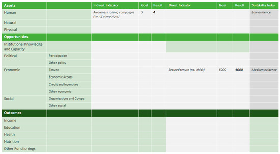 The resulting framework (see Figure 3) has three major categories of Assets, namely, Human, Natural and Physical, corresponding to three of the categories of capitals in the SLF [40]. These are intended to record and evaluate the influence of interventions on people’s natural assets, e.g., land use changes and water access; physical assets, e.g., equipment; and human assets, e.g., knowledge and skills. Note that the natural assets category can include indicators that capture increases in land cover and net primary productivity (NPP) that would be central to any biophysical evaluation of these projects, thus creating a point of contact between socio-economic and biophysical assessment. The Opportunities category, in the evaluative framework, contains four categories: Knowledge and capacity (at the institutional as opposed to the individual level) and Political, Economic and Social opportunities. The latter three correspond to three of the five institutional freedoms described in the capability approach [31]. In the framework, they are further subdivided according to data from the literature review.